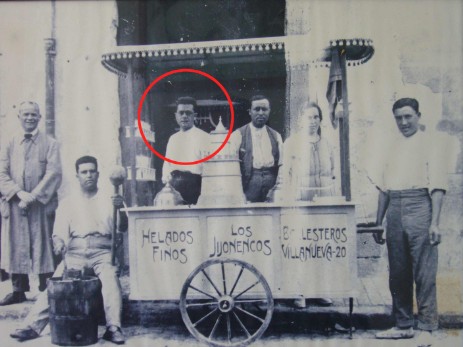 D. Francisco Sirvent Gisbert aparece señalado con un círculo rojo. La foto pertenece a 1924. En ella se puede ver a familiares y trabajadores en la antigua heladería de Orihuela.